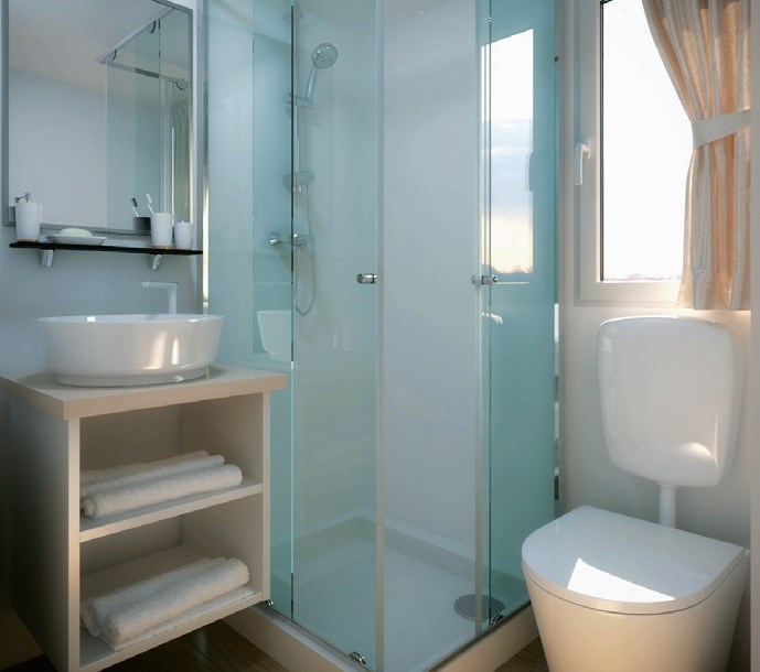 - 2× sociálne zariadenie (sprcha, toaleta, umývadlo, fén)