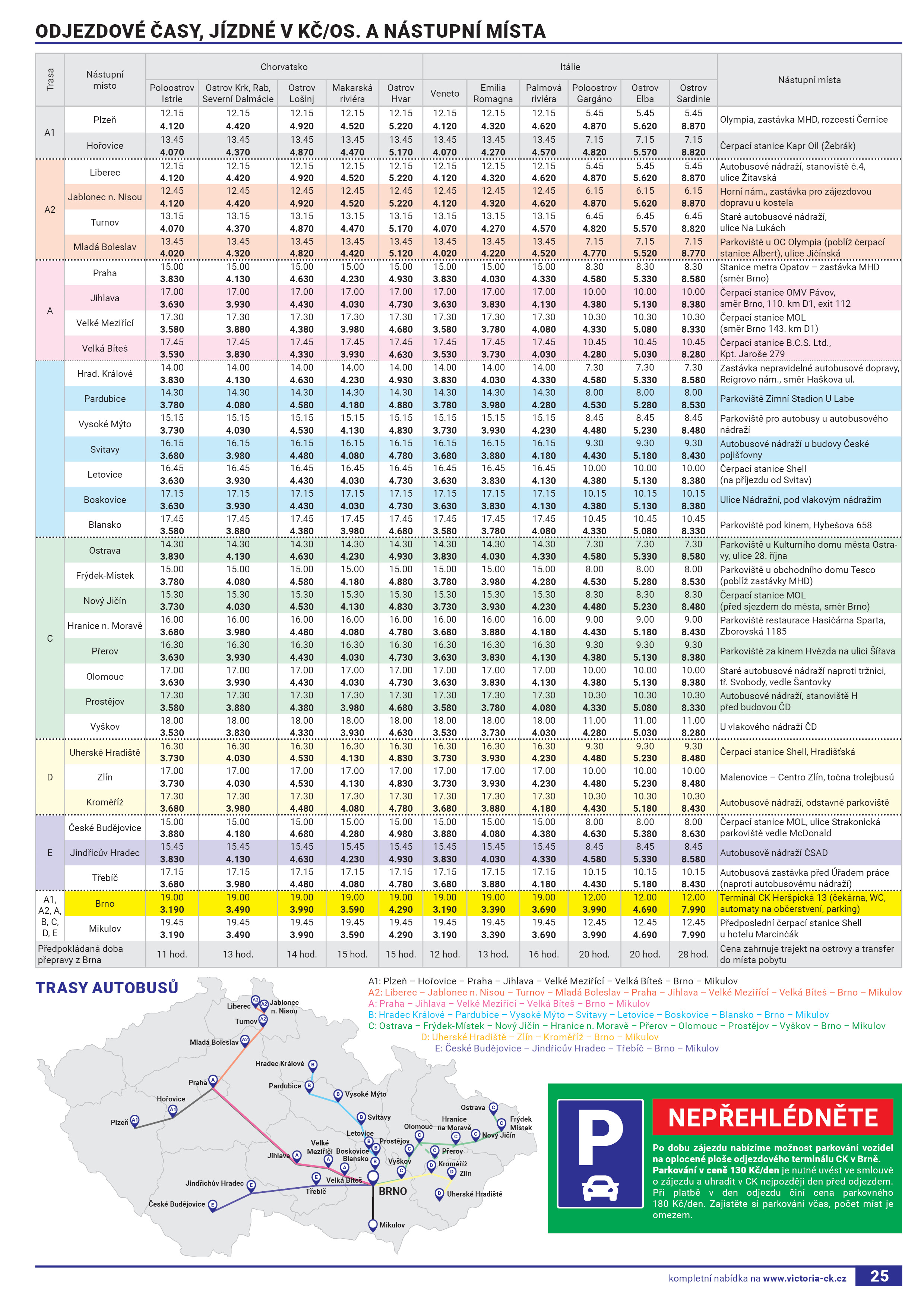 Odchody zo stredísk sú vo väčšine prípadov naplánované na podvečerné hodiny, príchod do SR (ČR) je potom druhý deň v ranných resp. dopoludňajších hodinách. Vzhľadom k nepredvídateľným okolnostiam, ktoré sa môžu vyskytnúť v doprave (počasie, kontrola cestovných dokladov, technické problémy, preplnené cestné koridory a pod.) môže dôjsť k predĺženiu predpokladanej doby prepravy, prípadne ku zmene v hodine odchodu a príchodu. Napriek maximálnej snahe nemôže cestovná kancelária väčšinou tieto okolnosti ovplyvniť ani vylúčiť. Neodporúčame našim klientom dojednávať si dôležité rokovania alebo schôdzky v deň odchodu a príchodu. Upozorňujeme tiež na skutočnosť, že prvý a posledný deň v cieľovom mieste zájazdu je určený ešte na prepravu, nie na samotnú rekreáciu. Z dôvodu zachovania priaznivej ceny dopravy, najmä v okrajových termínoch, môže dôjsť v rámci jednoho autobusu k spojeniu viacerých pobytových miest.